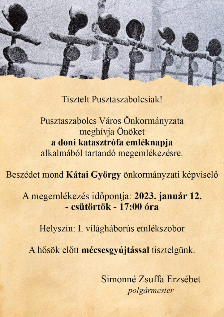 Hírek, közlemények Meghívó a doni katasztrófa áldozatainak emléknapja alkalmából tartandó megemlékezésre 2023.01.10. kommunikacio 184 Views