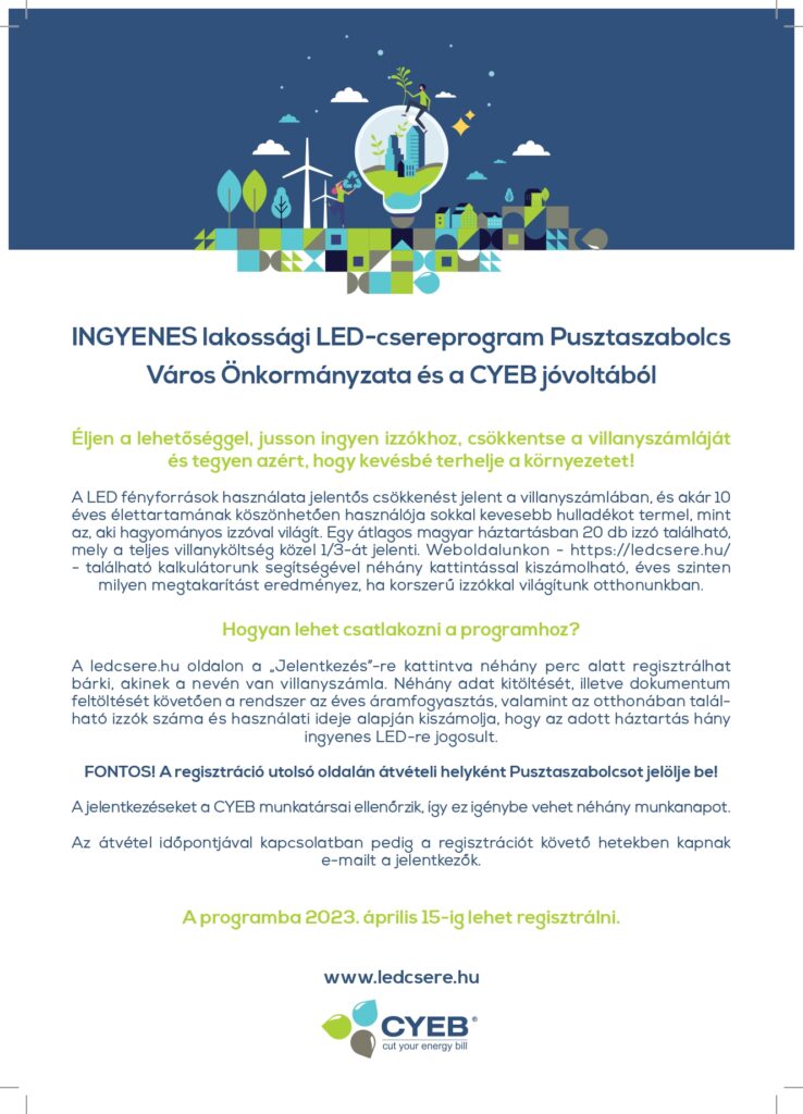Pusztaszabolcs Város Önkormányzat és a CYEB Energiamegoldások Kft. együttműködésének eredményeként lakossági Led-csereprogram indul március 16-tól városunkban. Az izzókat mindenki ingyenesen kapja meg, csupán regisztrálni kell a https://ledcsere.hu oldalon. Ennek során meg kell adni a személyes adatokat (név, e-mail cím, telefonszám), fel kell tölteni a felületre az igénylő személyi igazolványának és lakcímkártyájának mindkét oldaláról készült, jól olvasható fényképét, valamint a villanyszámláról készült, szintén jól olvasható fényképet. Ezek eredetijét mindenki szíveskedjen magával vinni az izzók átvételéhez.