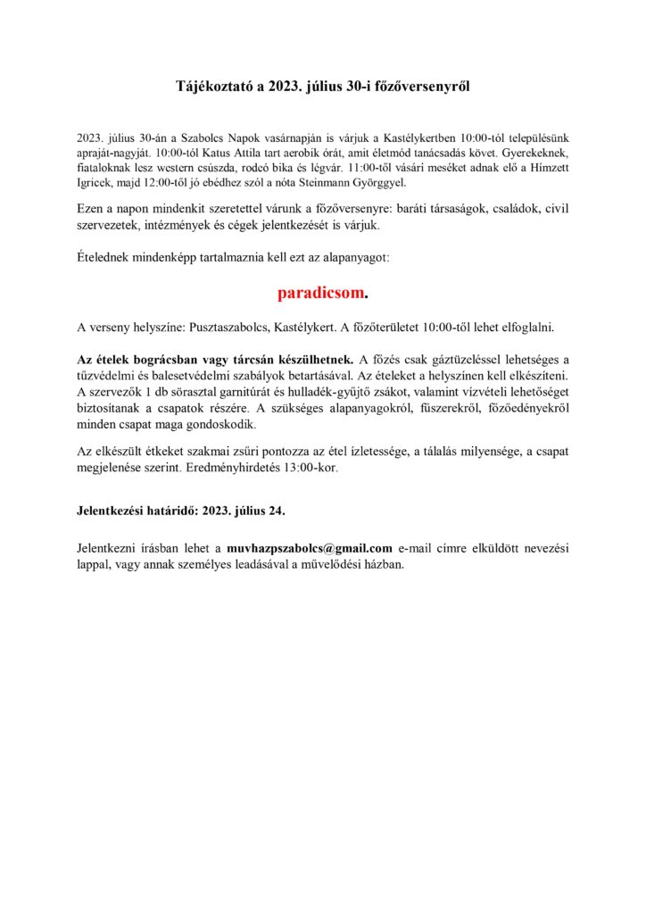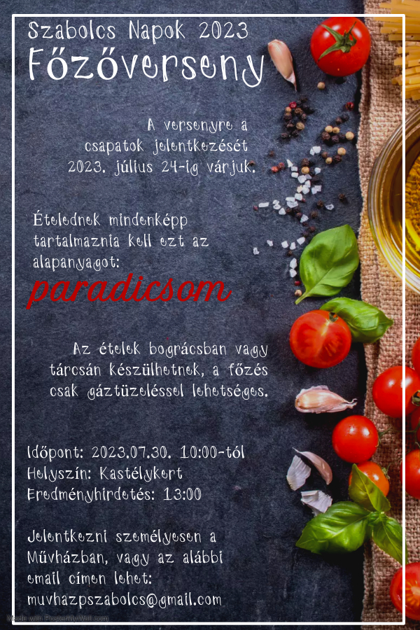 Hírek, közlemények Főzőverseny 2023.07.13. kommunikacio 141 Views Idei évben Szabolcs Napok alkalmából főzőversenyt hirdetünk. Részletek a leírásban: