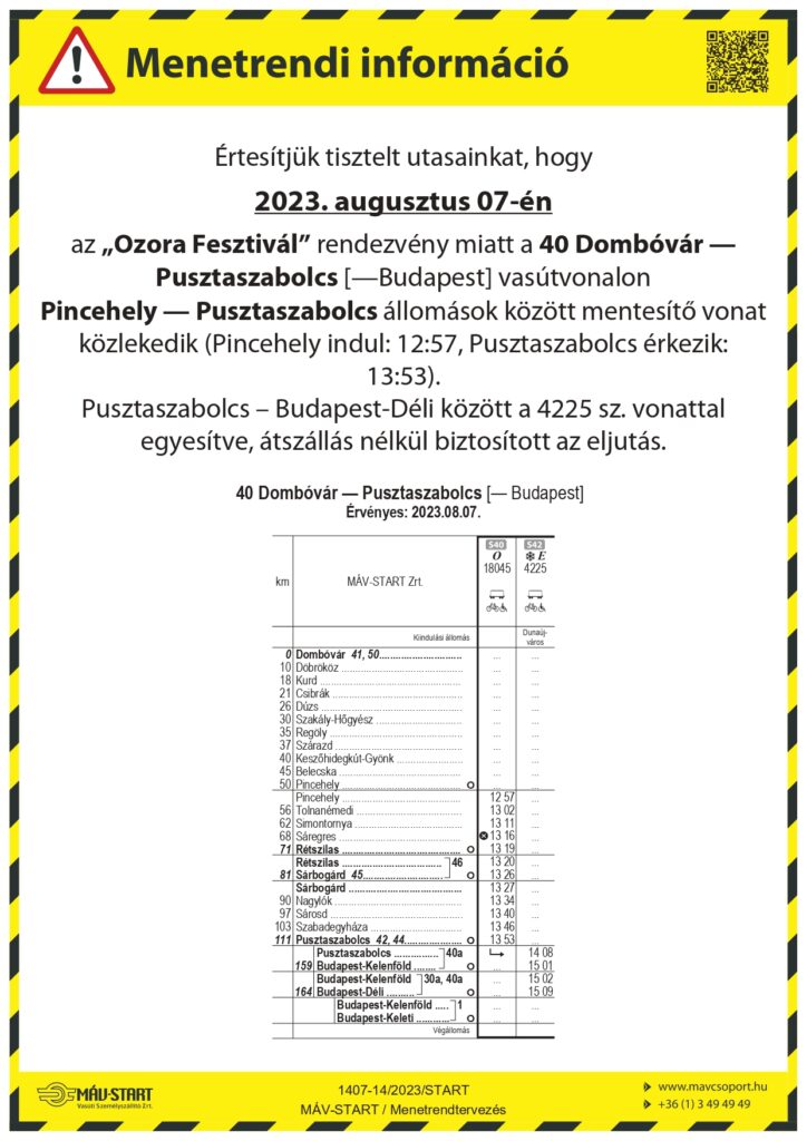 A MÁV-START Zrt. tájékoztatta az Igazgatóságot, hogy 2023. augusztus 07-én az „Ozora Fesztivál” rendezvény miatt a 40 sz. Dombóvár — Pusztaszabolcs [—Budapest] vasútvonalon Pincehely — Pusztaszabolcs állomások között mentesítő vonat közlekedik (Pincehely indul: 12:57, Pusztaszabolcs érkezik: 13:53). Pusztaszabolcs – Budapest-Déli között a 4225 sz. vonattal egyesítve, átszállás nélkül biztosított az eljutás.