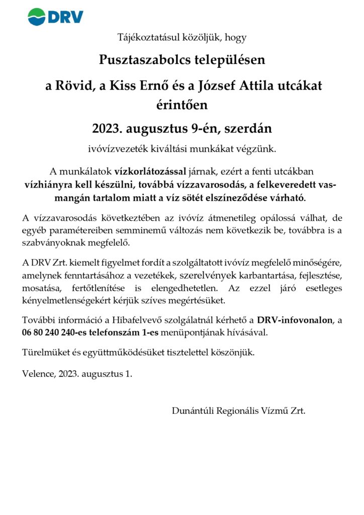 Tájékoztatásul közöljük, hogy Pusztaszabolcs településen a Rövid, a Kiss Ernő és a József Attila utcákat érintően 2023. augusztus 9-én, szerdán Ivóvízvezeték kiváltási munkákat végzünk. A munkálatok vízkorlátozással járnak, ezért a fenti utcákban vízhiányra kell készülni, továbbá vízzavarosodás, a felkeveredett vas-mangán tartalom miatt a víz sötét elszíneződése várható.