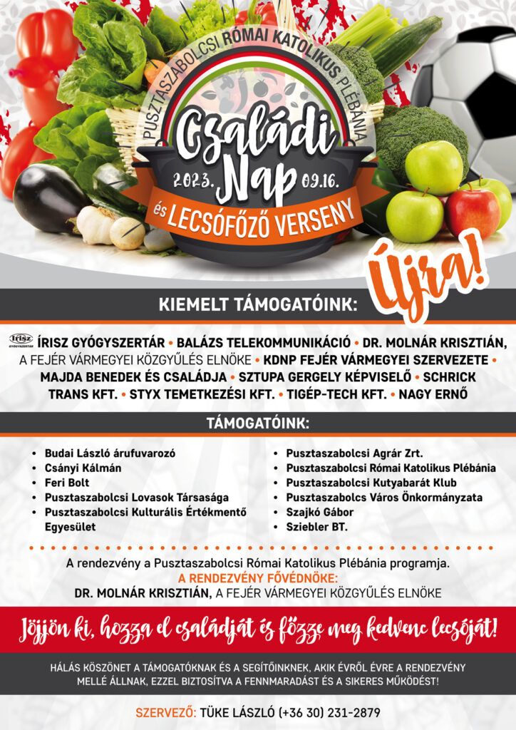 Pusztaszabolcsi Templom téren 2023. szeptember 16-án kerül megrendezésre a hagyományos Családi nap és Lecsófőző verseny melyre a rendezők szeretettel várnak mindenkit.