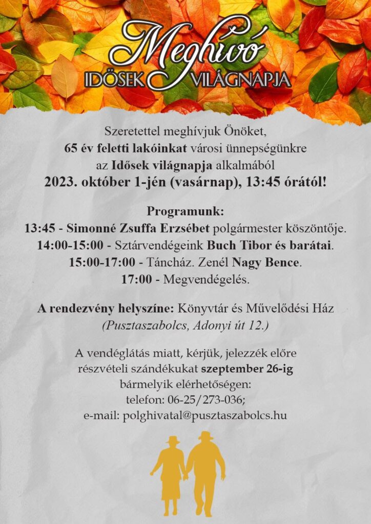 Október 1-jén, vasárnap, délután 14 órától, a Művelődési Házban Önöket, azaz, az idős és szépkorú pusztaszabolcsiakat ünnepeljük. Az ünnepség után megvendégeljük Önöket, és egy kis szórakozást is ajánlunk, feledtetve az elszállt éveket.