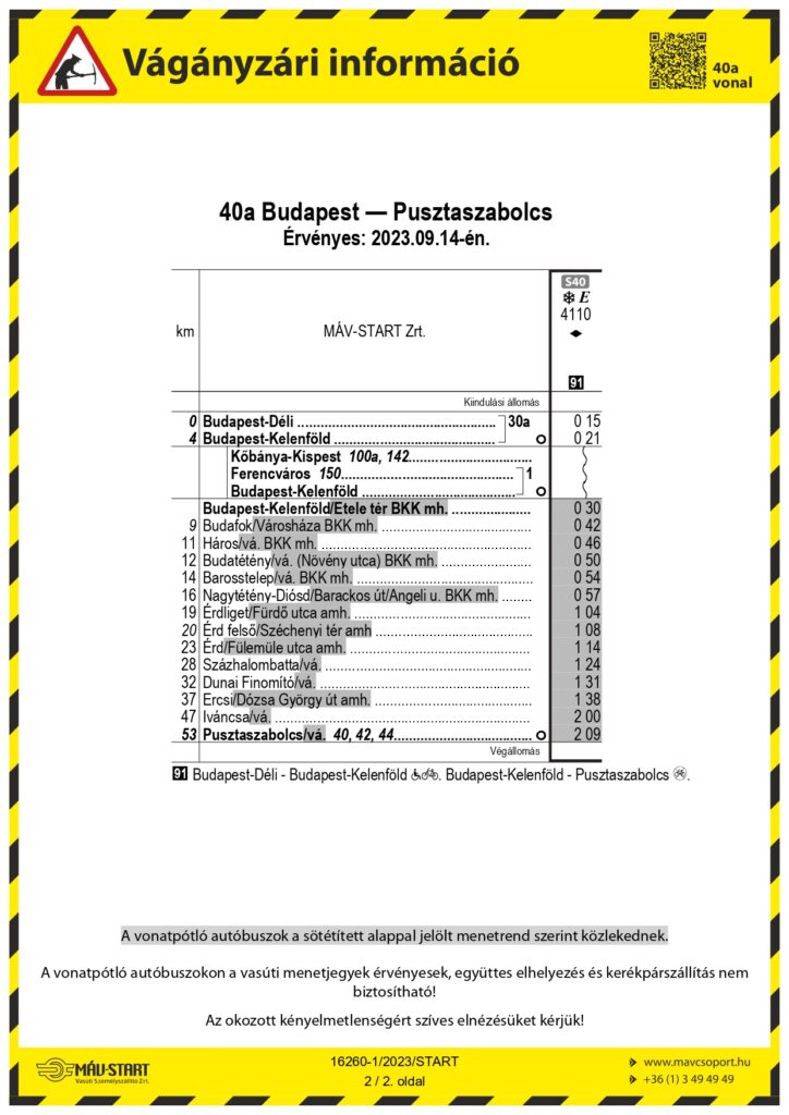 A MÁV-START Zrt. tájékoztatása szerint 2023. szeptember 14-én Budapest-Kelenföld — Pusztaszabolcs állomások között végzett pályakarbantartási munkák miatt a 40a Budapest — Pusztaszabolcs vasútvonalon a 4110 sz. vonat menetrendje változik.