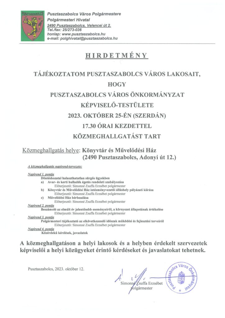 Közmeghallgatás lesz a Művelődési Házban a meghívón látható időpontban. Kérem Önöket, hogy minél többen jöjjenek el, kérdezzenek, és mi mindenre válaszolunk, mindent tisztázhatunk annak érdekében is, hogy Pusztaszabolcs választott vezetése és polgárai végre tiszta lelkiismerettel, tiszta lappal, hazugságok és politikai vádaskodások nélkül, közösen nekifuthassunk az önkormányzati választásoknak. Itt van ugyanis a lehetőség, hogy a Közmeghallgatáson egymás szemébe nézzünk, és egyenes gerinccel kérdezzünk, válaszoljunk egymásnak! Egészséges és tisztességes, erkölcsös jövőt csak őszinte, egymás megbecsülését mindennél fontosabbnak tartva tudunk építeni. Ez legyen az Önök szeme előtt is! Mindenkit szeretettel várok!
