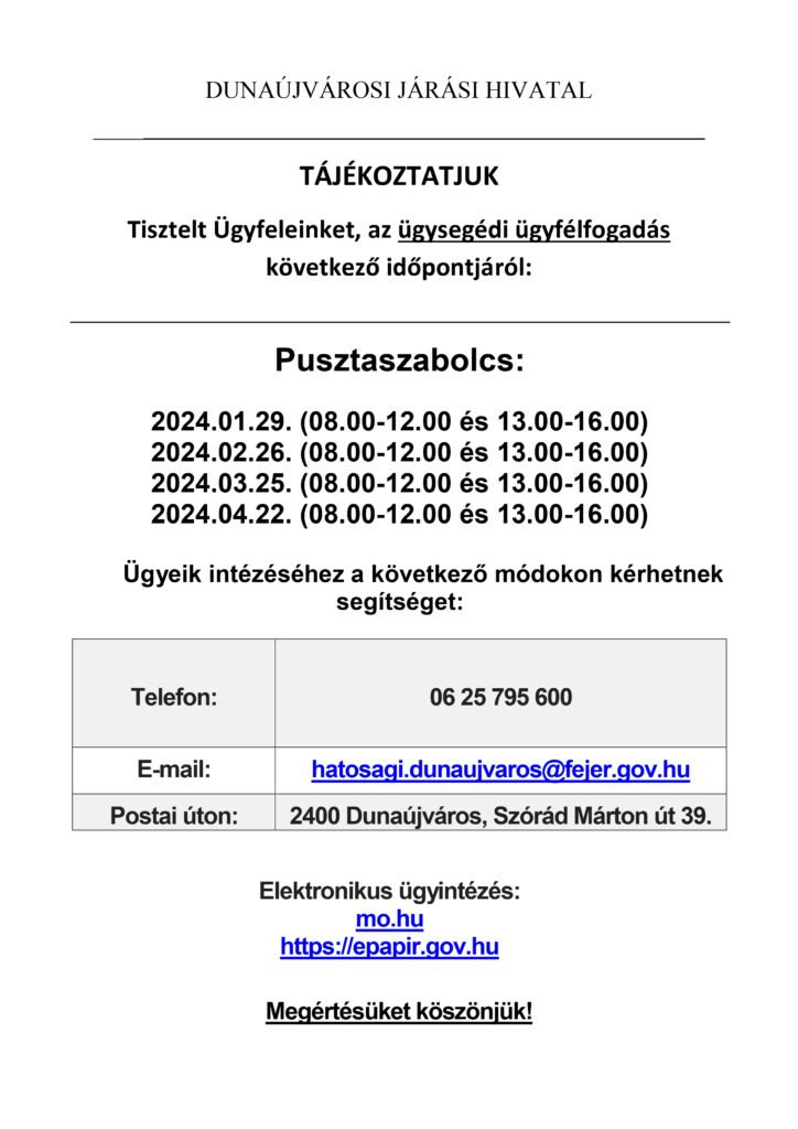 Az alábbi időpontokban a Polgármesteri Hivatalban lesz elérhető a Winklerné Kaluz Diána ügysegédi ügyfélfogadás céljából.