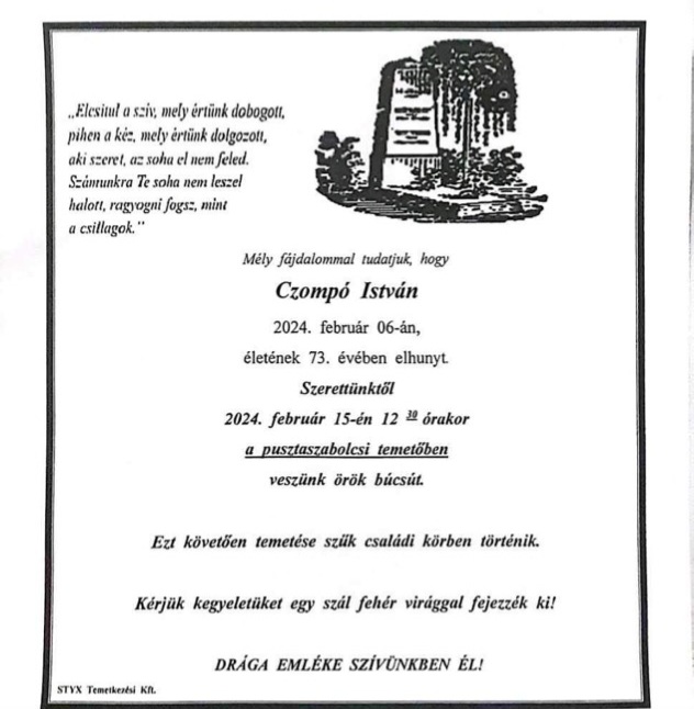 A búcsúztató helye, időpontja: Pusztaszabolcsi temető 2024. február 15. 12:30 órakor