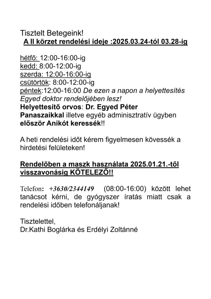A II. körzet rendelési ideje 2025.03.24-28-ig