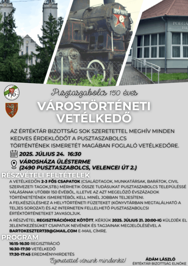A Pusztaszabolcsi Értéktárbizottság Várostörténeti Vetélkedőt szervez a Szabolcs napok keretében, melyre szeretettel várunk minden érdeklődőt.