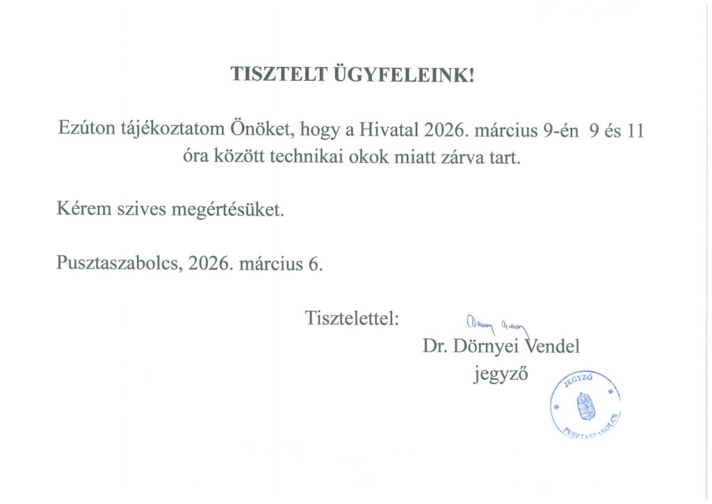 Hírek, közlemények A polgármesteri hivatal nyitvatartási rendjének változása 2026.03.06. admin 252 Views